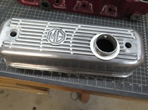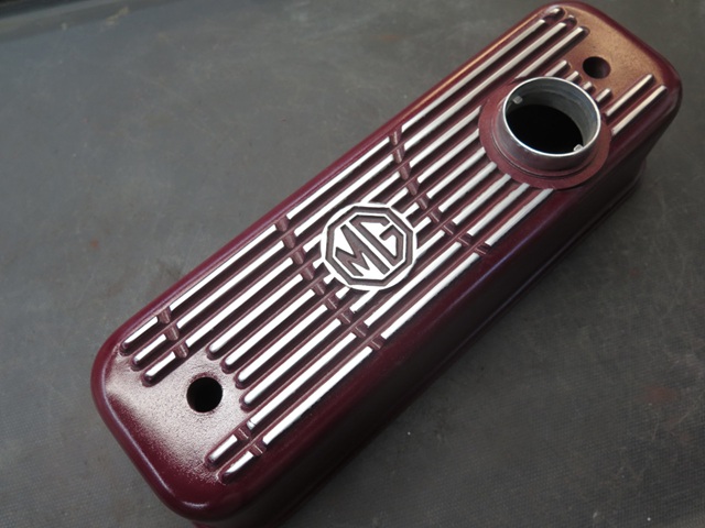 I like ribbed cast aluminum rocker covers. I'm not sure what it is, but to me, they seem to add a little gravitas to an engine bay. I don't, however, like the silver color that much. It's just a little too much shine or something. -- So the middle ground for me is a painted cover with just a little shine. This is the route I took on both my TR6 and GT6 cars. And as a small personal touch they both have a series of radiating arcs cut into the fins. -- I decided to continue the tradition on the MGA, though the shorter dimension doesn't let the arc pattern develop quite as much.