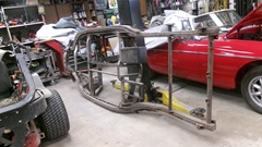 Say hello to Bill Allen in Norristown, PA. He has been working with vintage British cars for decades. His most recent completed full restoration is the beautiful red MGB. Since then he has been restoring an MGA Coupe with frame and bodywork mostly completed, all of the original parts still there to put it back together. There is also a complete MGA Coupe with some typical rust in the doglegs and body sills, never disassembled, a very good candidate for a restoration project. And there is an MGA roadster with body off, much frame and bodywork done, and should be all parts there for the whole car. There may be some dimensional problem with this frame that makes it unusable as is, or may require more work to correct the issues before it could be used. As such, he may be willing to sell the roadster body separate from the rest. Contact Bill for such discussion.
