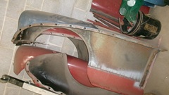 More body parts for the Coupe currently under restoration, the RF wing with a lower panel repair section already stitched in, more spare wings, boot lid and bonnet, two doors with complete roll-up window assemblies, and the fuel tank.