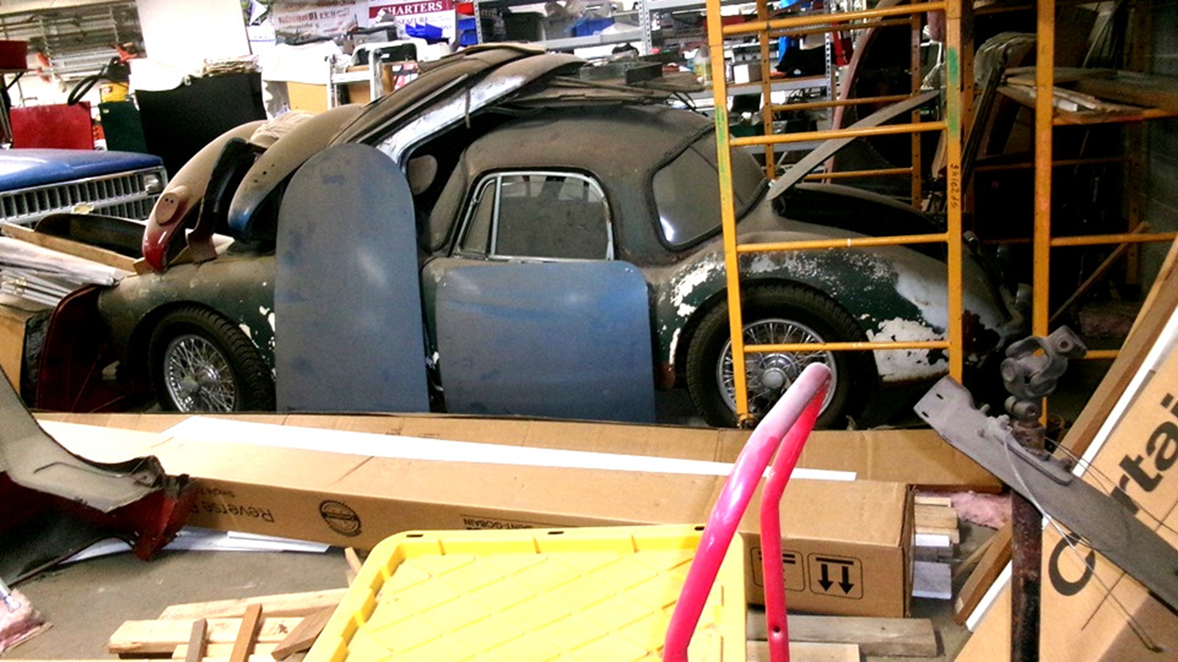 A rolling chassis for another MGA, tunnel parts, convertible top frame, and fuel tank in situ, front and rear main body sections separated at the sills below the doors, more fenders in blue. The more you look, the more you find.