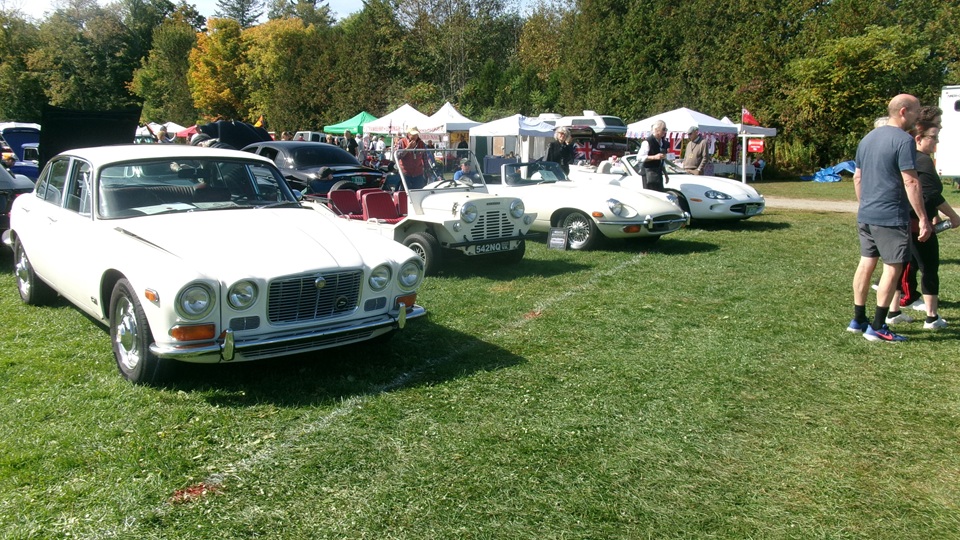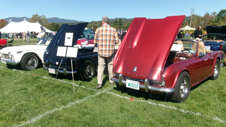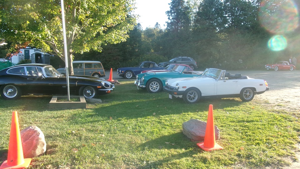 First incident for the week end was a dent in the LR fender of a Triumph, lightly grazed by a big Jaguar sedan. We picked up the registration packet, grabbed a beer and sat to chat with a few folks.
