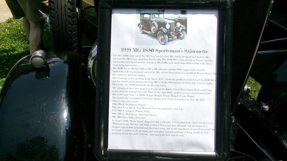 Lots of cars here, more than 50 show cars by my count. Let's start with the Premier class, best of the best, cars that have won best in class for the past year or two. There are two MG 18/80 cars from the way back machine. One 1929 Sportsman Saloonette, and one 1930 MK-II open Tourer. Seems like they had to beg and grovel to be admitted into the NA MMM Register, being not Midget, Magna nor Magnette.