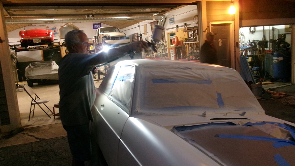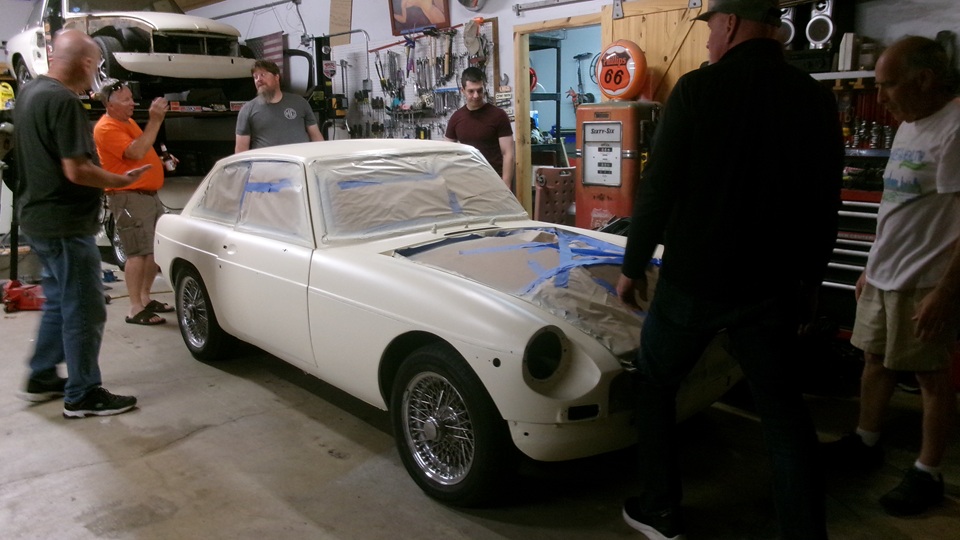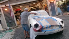 Last spots coverage, finishing an extra coat late evening with a hand held LED lamp, and putting it to bed for the night. This may be wishful thinking, but they would like to finish sand and, 2nd prime, finish sand again, and spray it Orange before (maybe) taking it to the British Car Festival for display on September 7. Check back later.