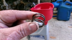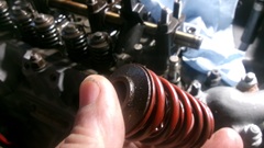 As navigator was pouring yesterday's dirty engine oil from drain pan into a jug for recycling, he found this mysterious spring in the pan. A fat short compression spring with closed end coils to have flat ends, may be some sort of force or pressure control spring. At the time no one could identify it, not like any car part ever seen, not an MG or VW part, and why was it in the oil drain pan? The answer was revealed "later tonight "as I was posting Thursday's photos and notes. Looking back to the last row of pictures from Thursday at the open oil filter can, this spring is just peaking out of the oil puddle in the can. It is apparently the filter element end load and bypass pressure relief spring from inside the oil filter. We had a second drain pan to catch the dribble when the oil filter was unscrewed, dropping the filter into the second pan with the dribble. That pan went to the work bench while the filter was being cut open. Then the filter can was dropped back into the pan, and a bit later the can was tossed into the trash while the remaining oil from the filter was poured into the first drain pan, so the second pan could be cleaned. Mystery solved, what is the spring and how it got into the primary oil drain pan.