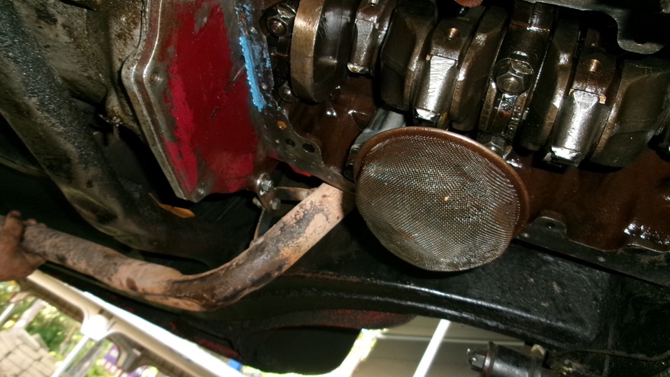 Our one serious goal today was to change the worn connecting rod bearings in the MGA. Feeling confident we can get this cone in one day, we arrived late morning, about 11-ish.Give the Rabbit a little nudge so we can pull the MGA up in front, jack it up to set on four stands, a little higher in front this time, and front wheels off. Not long to drain the oil and remove the filter. Also remove two bolts at bottom of the bellhousing, as the oil pan has to drop down that far in back. 19 quarter inch hex head screws would be a breeze with a small power wrench, except that five of them in front are very close quarters above the front suspension cross member. Three in the middle can be removed with socket tools with a quarter drive U-join. The two front corner screws can only be reached with a 7/16" offset box end wrench, and maybe thin double jointed fingers. But been there and done that before, so just knowing it can be done is good encouragement. Given an hour of persistence, the sump was removed, along with the oil pump and pick-up screen. Swapping the connecting rod big end bearings was straight forward, knock back locktabs, remove two bolts,and the bring cap with half shell is in the hand. No spun bearings, but the shells were through the white metal, touching the copper, not yet through to the steel.The crankshaft journals seem to be okay, very lucky at this stage. of wear.