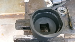 On to my more interesting task for the day, "porting out" the new 1-59-64" 4-flat wrench socket to fit the 1-15/16" octagonal nut for the rear wheel bearing hub. I have never ported a cylinder head, but at least I get to use the tools. Enter the air powered die grinder, which might be overkill, but sure makes this job easy.