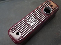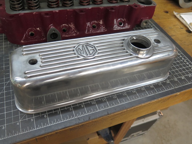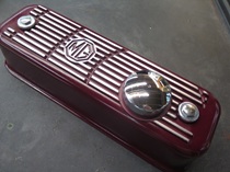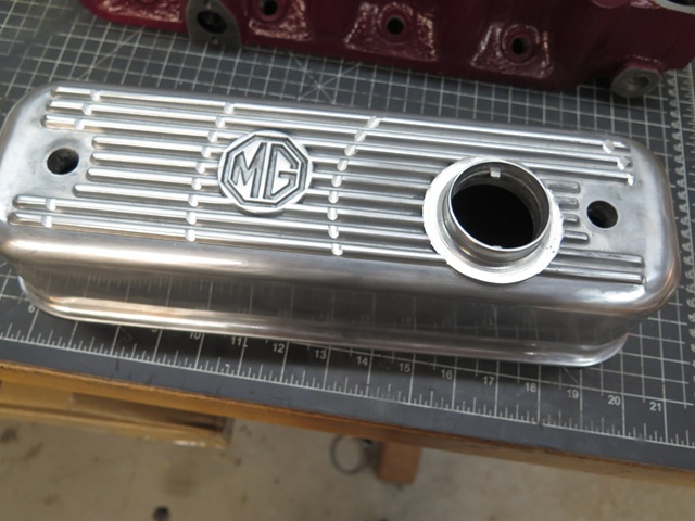 I like ribbed cast aluminum rocker covers. I'm not sure what it is, but to me, they seem to add a little gravitas to an engine bay. I don't, however, like the silver color that much. It's just a little too much shine or something. -- So the middle ground for me is a painted cover with just a little shine. This is the route I took on both my TR6 and GT6 cars. And as a small personal touch they both have a series of radiating arcs cut into the fins. -- I decided to continue the tradition on the MGA, though the shorter dimension doesn't let the arc pattern develop quite as much.