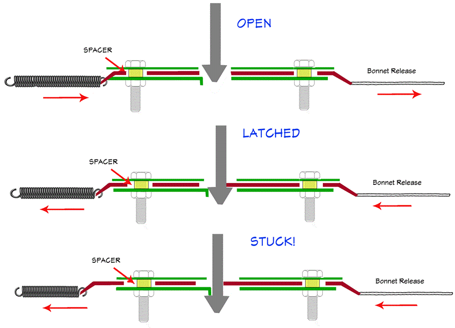 Notice that the spring loaded slider tends to push the latch pin to the left. If the latch pin is adjusted too long, or the bonnet is pushed too far down when closing, then the latch pin head might be pushed excessively down to end up below the short hanging finger of the bottom plate. That is how the latch pin might end up stuck underneath the hanging finger with the bonnet firmly stuck shut.