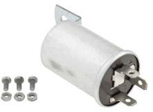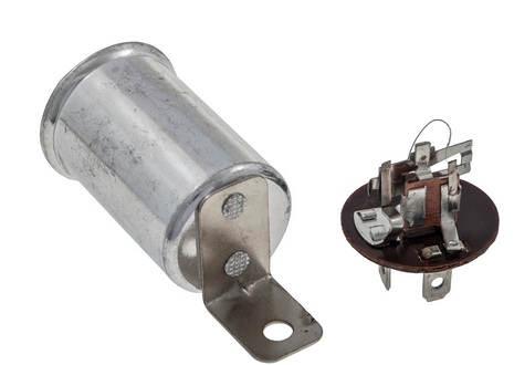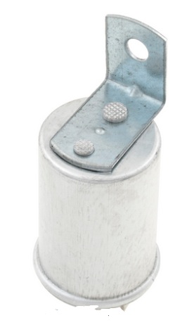 NOTICE: The pictures above are not as original for the MGA. The pictures are for an aftermarkrt part number GFU2101, which is a very poor reproduction part. The riveted "L"shape mounting tab and shape of the canister are correct. There are no markings on the canister, where original parts had the name "LUCAS" stamped in the cannister wall along with the Lucas part number and production date. The push-on spade terminals have clearance holes where original parts had extruded/embossed holes with tapped threads to accept pan head screws. Without the tapped threads, the ring lug wire ends of the original harness have to be secured with small screws and loose nuts, which is a general pain for installation, as well as not original apperance. The functional thermal flasher unit that fits inside is much smaller than the original parts which mostly filled the the canister). And the reliability of this unit is somewhat suspect with many reports of early demise. Let the buyer beware. For more information on diagnosing and testing a thermal flasher unit, see ET-104 |