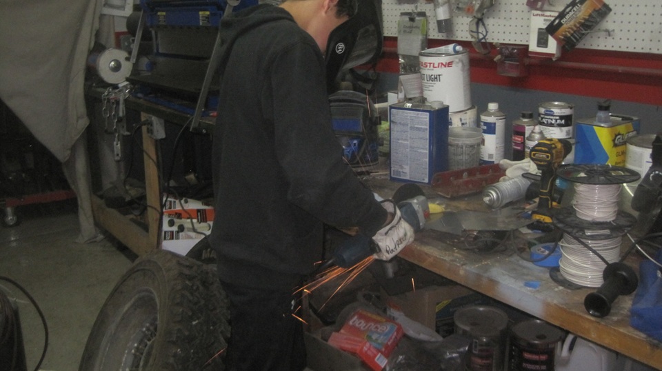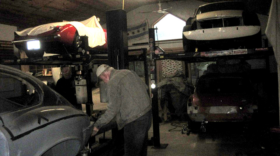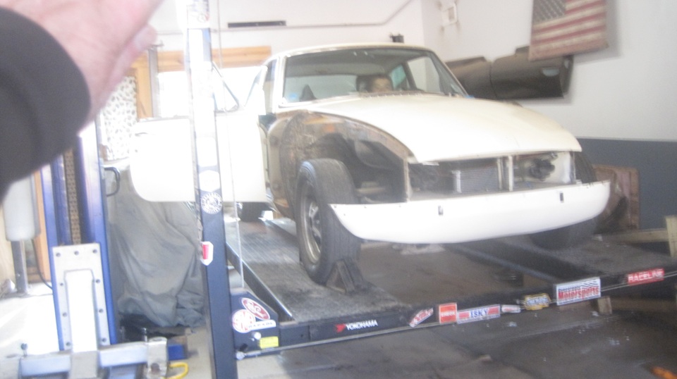 The "kid's BGT" was on the hoist, and after some encouragement and friendly advice it was running briefly. Later in the evening the right side door was removed,and they were grinding some rust on the body sill.