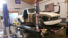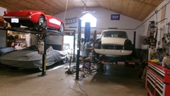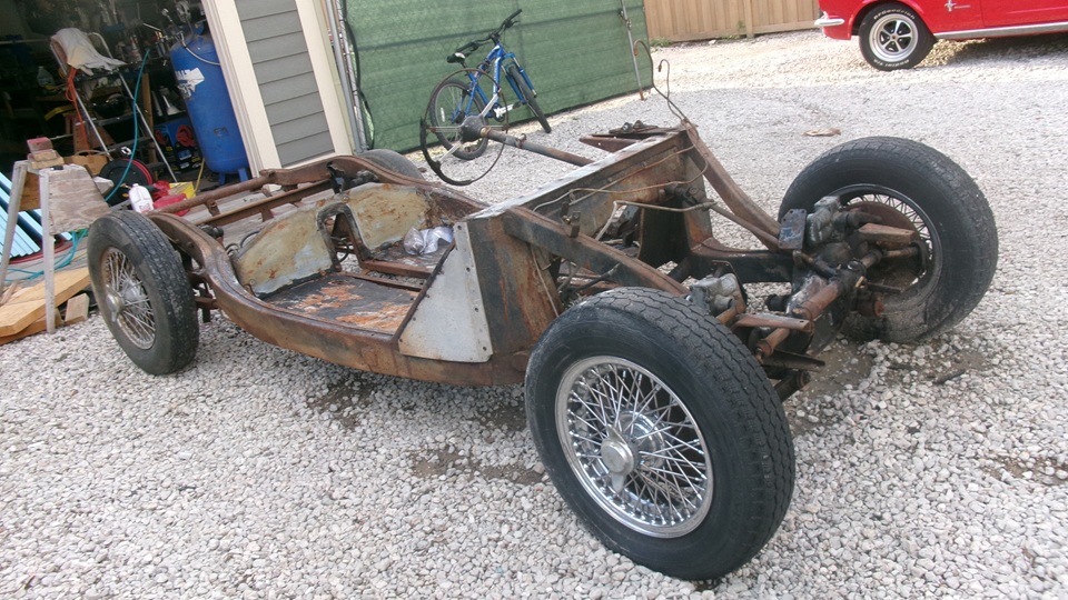 The white MGB on the low rack is Tom's son's car, which was just made running and drivable last month. Now most of the structural underbody work finished, working on spot patching and rust removal. The naked MGA rolling chassis recently procured is planned to become a California Fun Buggy.