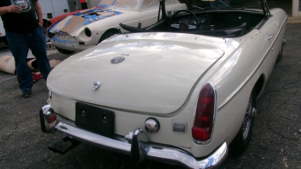 Since we are still hanging around the upper midwest, we drop in on the Wednesday Night Garge Club(again). The white MGB that was totaled out a few weeks ago has been poked and probed by multiple people placing dibs on various parts for recycling into other cars. The CMGC club project car has a little attention since last week, with some blue spot putty.