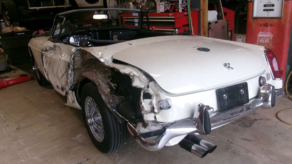 This was very nicely restored MGB. It was on its way to MG2025 car show in Crystal Lake, IL in late July when it was hit by a truck in northern Indiana. Total write-off paid by the insurance company, then sold back to the owner for salvage value (about 10% of book value before the accident). Now going to be disassembled to recycle the good parts, including the good engine and an early 3-synchronizer overdrive gearbox, and all of the chassis parts.