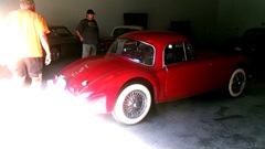 They have this neat 4-bolt plate tool to attach to the carburetors to R&R them as an assembly, keeping the choke and throttle linkages together. During the process they did not find the half piece of the split cotter, so either it never fell in, or it may have found its way down though an oil drain hole to the sump, where it will do no harm anyway. Once the tappet cover was reinstalled, and the manifold and carbs were back in place, it was enough for one day. When almost everyone had left, two more friends of the friends showed up with a Porsche GTS and a Jag E-Type. Hello and goodbye, lock up and we're out of here.