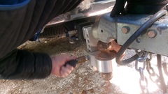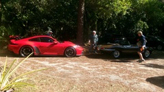 There was a marginally funny (but serious) issue while driving the Rabbit onto the trailer. The truck was last used to tow a different trailer, and it had the wrong (too small) hitch ball on top, so the trailer hitch was not securely coupled. As the car was driven onto the tail of the trailer, the trailer tilted, and someone who was standing on the front of the trailer was casually launched over the side, not significantly injured, other than his pride. When the car was backed away, the trailer hitch landed back on the hitch ball. Not long to crank up the trailer hitch jack to change the tow ball on the truck, and get it securely couple up. Then drive the Rabbit properly onto the trailer and get it tied down ready to travel.