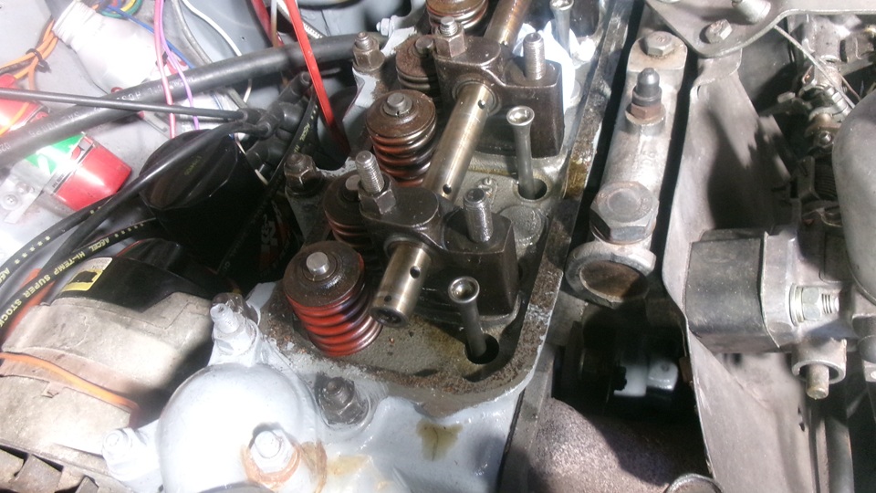 This allows use of a special tool to hook under the rocker shaft and push down on the spring caps. Seems to generate more frustration than progress. There is a picture of a nice 1-5/16" wrench heated and bent to suit for easier access to the crankshaft front bolt.