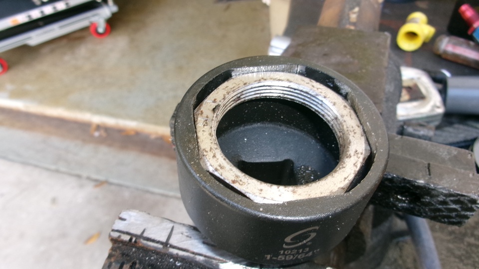 Socket 1=59/32 Someone on a BBS recently reminded us that there is a large 4-point wrench socket 1-59-64" across flats, special for a Chrysler rear ball joint socket, that can be adapted with a little hand grinding to fit the MGA (and early MGB) rear hub bearing locking nut (1-15/16" AF octagon). So we just ordered one of those from Amazon (along with a few more items), which should arrive Tuesday.