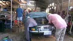Back to the MGB with fresh clutch, with engine and gearbox already back in place (last week). The swarm was heavy into this with multi-processing., installing the radiator with mounting diaphragm, generator, oil filter, starter motor. Also connecting the exhaust pipe flanges to the exhaust manifold, and installing carburetors. When the clutch slave cylinder was installed, there was time spent with a stubborn bleeding process. There was a fair amount of fettling with carb linkages, as frayed pull cables needed special attention, and not everyone was intimately familiar with the full configuration of the linkage attachments.