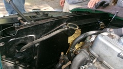 after which they were anxious to get the car out. But I was insisting to drill the alignment holes through the hinge brackets so they won't have to fight this again next time the bonnet needs to be removed. As was, there were holes through the hinges, but no holes in the bonnet brackets. That means this bonnet was a replacement part since the last time it was drilled. The existing holes were 5/32" where I was expecting 1/8". No problem, just grab a 5/32" drill bit from the Magic Trailer, and a power drill with one of the new batteries, and in just a minute there were four new holes all in alignment, ready to pin the bonnet in place next time it needed to be reinstalled.