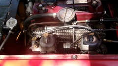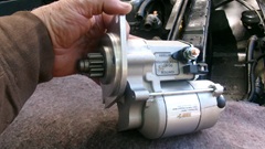 One sad boo for the day, the new pre-engage gear-reduction starter motor didn't fit in the car. the motor housing extended on one side is clocked wrong, so it hits the steel clutch hydraulic pipe, just above where the clutch slave hose bracket is welded on the unibody. Gawd, I feel bad for this guy, after my recent fiasco with the new MGA radiator that didn't fit in the car (and still hasn't been returned). The old (black) inertia starter recently removed has a very badly worn pinion gear (and worn ring gear as well) that is on its last legs and will jam frequently. We groused around in the attic to find another (red) similar inertia starter with a much better pinion gear. We are all wondering if this is the one removed from my MGA when I installed a gear reduction starter several years ago (maybe). Connecting them to a battery jumper box had both jumping to life equally well, so the red one was installed in the car with a prayer and a song, as they are not pulling the power unit again to change the ring gear. With several starts, this one only jammed once, so that should get him by until he can exchange the new incorrect gear reduction starter for the correct model. All said, put the jumper battery box back in the shop and plug it in to recharge.