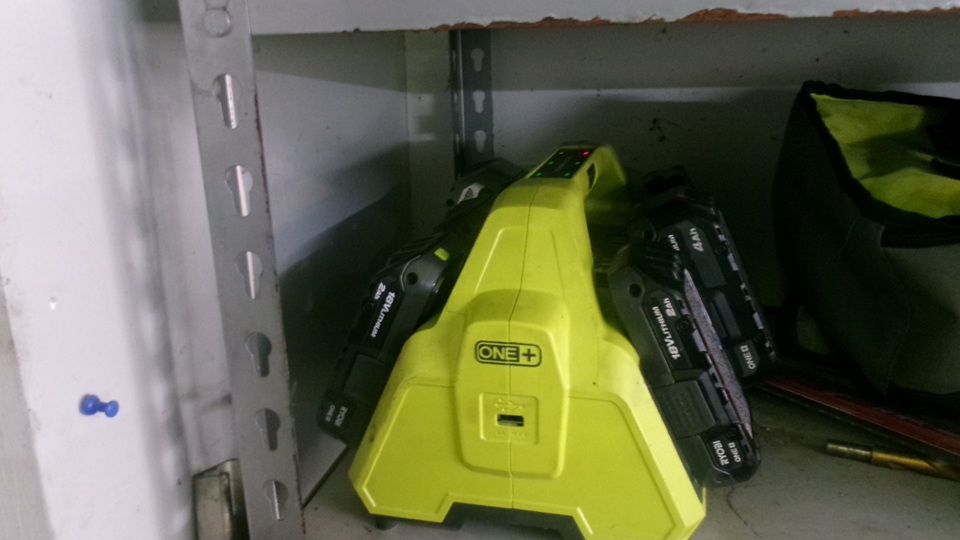 Good morning, work day at Tech Central. It is notable that our friend with the MGB currently undergoing the clutch replacement was feeling generous, and procured four new 18-volt battery packs for the large assortment of power tools. We had been down to three, one junk and only two that held charge. Now there is a full compliment of good batteries on the 6-pack charger. the yellow MGB needing to be moved out of the way was displaying a small rust hole in the right side body sill.
