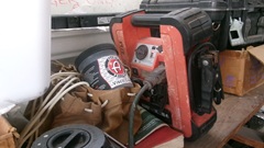 Fully loaded, including a hack saw dropped in the top before closing. I haven't weighed it, but figure about 40-pounds packed to go,and still lift and carry with one hand. And there it is dropped back into its normal home the trailer with minimal space required.
