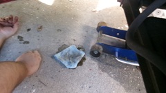 a loose oil drain plug, which we overlooked when installing the 1800 engine with new crankshaft, 128-miles, 2-1/2 weeks go. OOPS! Easy fix, tighten the drain plug, and add 1/2 quart of oil to top up. -- While it was up with the front wheels off, we were looking to identify a notable "clunk" in the front suspension,which has been bugging us since about same time as the broken crankshaft back in November. That turned out to be loose swivel link trunnion bolts and loose upper a-arm pinch bolt in the RF suspension. those must have been left loose last time we were replacing lower a-arm bushings (15-mo, 16,700-mi). That was a bit of a shock, kick me now. Spend ten minutes checking and tightening all of the front suspension bolts.