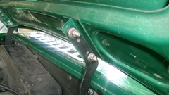 center exhaust hanger with one bolt missing and the second very loose about to fall out. The loose one remaining was coarse threaded with no lock washer, that figures. Not long to grab two new 1/4-28-UNF x 3/4 bolts with nuts and lock washers from the Magic Trailer, zip those into place, and it was good to go.