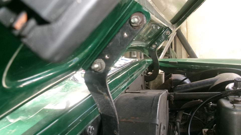 Then needing to make the bonnet fit, two people holding it to align while I was assembling bolts in the slotted brackets. Snug up just tight enough for some friction so it could be realigned with a push, pack some cardboard around the edges to give a little clearance and protect paint, push and nudge until it fits well, then open gently and tighten the bolts. That also worked,