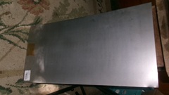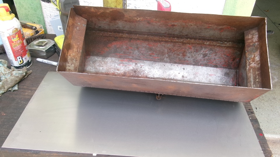 Someone at Tech Central was walking around with a piece of sheet metal in hand, to which I took an immediate interest. "Wazzat for"? "Oh, nothing, John said he didn't need it now". "I may have a use for it, how thick is it"? "I dunno, kinda thin, you need it, take it". So I snatched it. 12-inches by 24-inches by 22-gauge. I'm used to 18-gauge, 0.048" thick, common for MGA body panels, so this is somewhat thinner. But we've been wanting to repair an old steel hip roof tool box that we have been carrying in theMagic Trailer since 2014. The trailer is sometimes wet inside, so thesteel tool box rusted out the bottom, so you can't pick it up with anything in it. It may be okay if we can replace only the bottom panel. the new sheet measures 0.030" thick. The old tool box measures 0.040" thick. This might be close enough, certainly better than 0.000-thickness in the bottom panel. Set it aside for now, may be a good project for tomorrow.