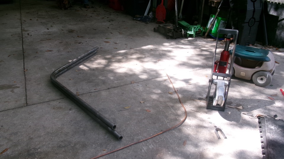 Firing up Tina, the wannabe race car. I think they just like to hear it run once a week. Today they get srtarted on fabricating a roll cage, beginning with two sides of the main hoop. They bought this hydraulic pipe bender, at least two years ago, knowing they would eventully be making a roll cage. I saw them using it once when it was new, but I think theywere only bending exhaust pipe tubing then. Now they are all anxious to see how it does on thick wall tubing, assentially 1-1/2" steel pipe.