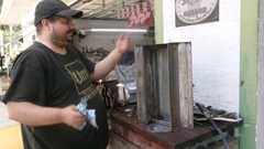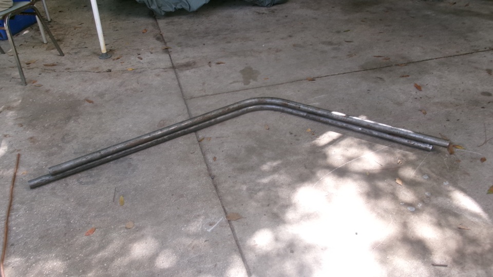 Kind of slow pumping, but seems to work pretty good, as long as there are extra hands to hang onto it, since it is not bolted down. There was a piece of copper tubing they formed byhand for the shape template. Once one came out good, it didn't take long to form thesecond one mto match. A little extra length on both ends, it will be cut to fit in the car before welding. Enough work for the old guys for one day. They will likely get back to it next week.