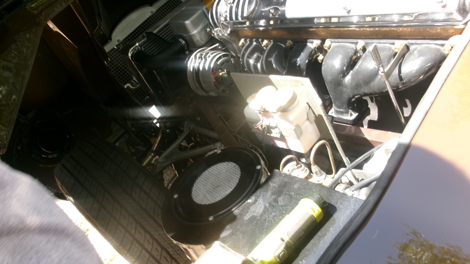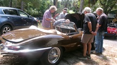 Break to check out the E-Type. The complaint here was the electric cooling fan kept running after the engine was shut down, and the fan ran long enough to erun the battery down, never shut off. They were looking at the thermostatic switch, and a DIN type relay. After a while it was all plugged in, and it was not running. So fire up the engine and let ir run to warm up enough to make the fan come on again, and a few minutes later shut it down and wait while the fan kept running. In about ten minutes it shut off. Really? It might be fixed, maybe or maybe not. If there is any more problem with it, I was suggesting that there may be a time delay relay available in the DIN format. Ten minute delay after switch off might be worth a try.