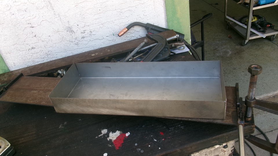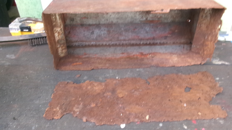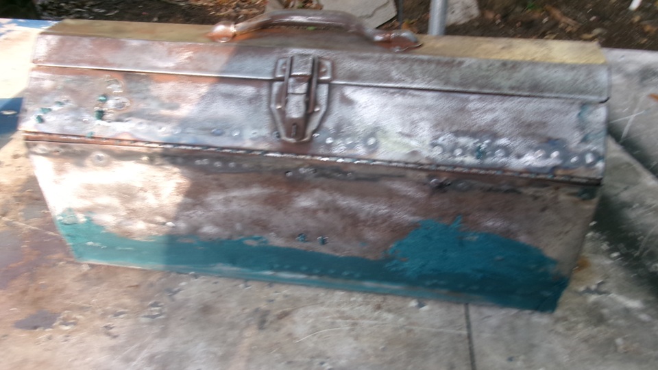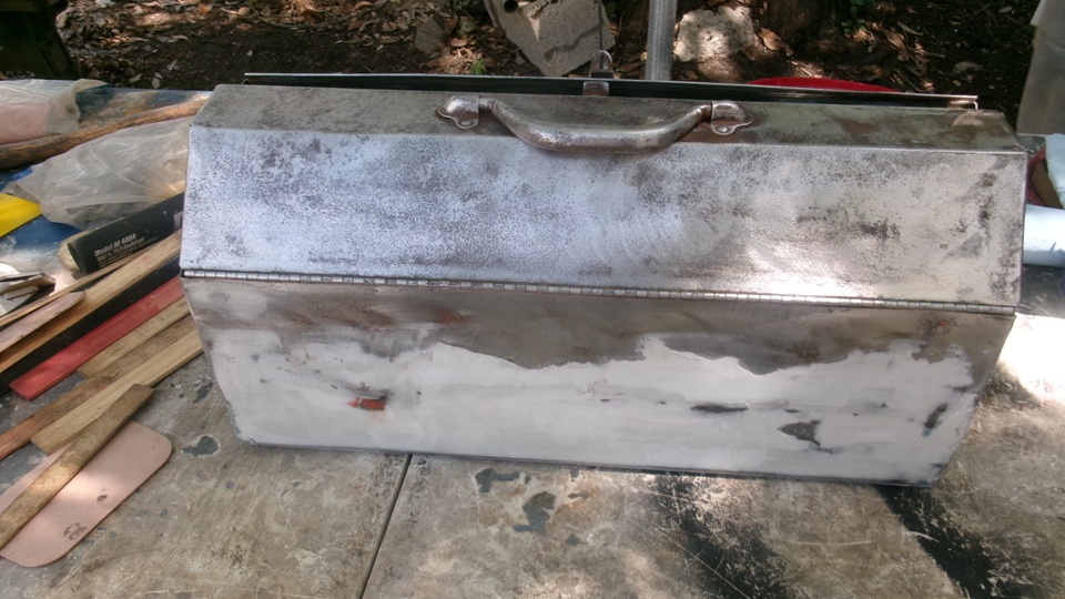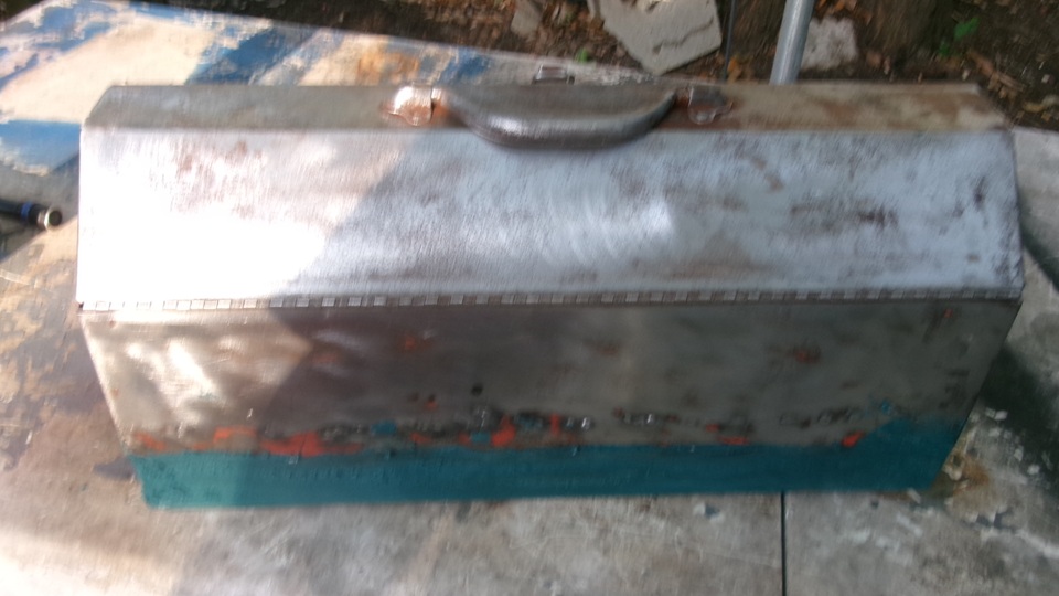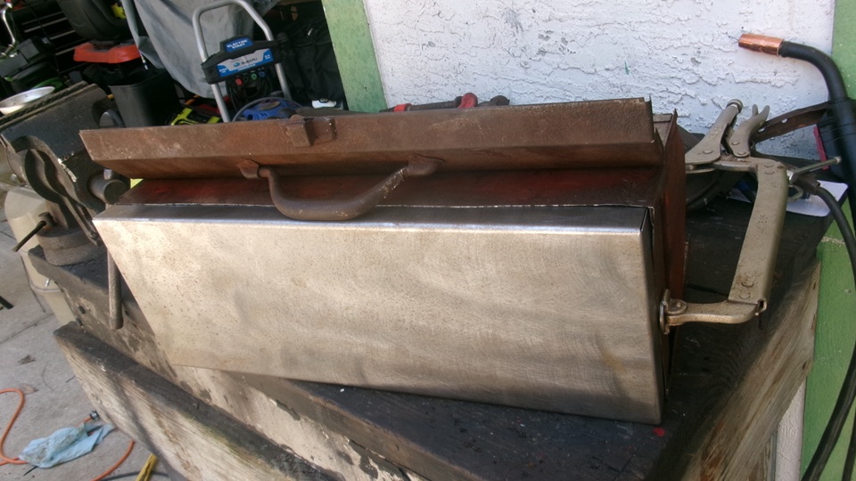 No need to cut the tray down, leave the 1-1/2" overlap, and put two pop rivets in each end to hold it in place. No spot welder handy, so spend some time with the MIG welder stitching in tack welds every 1/2" at the edge of the new metal inside, both sides (not at the ends where they hide inside under the end shelf gussets). Then more tack welds all around the outside to secure the bottom edge of the old metal. Then half an hour with a flap wheel sander in an angle grinder removing sharp burrs from all the tack welds. Some of the original spot welds for one of the hinges had broken loose along with some slightly bent edges at top of the side wall, so more time with clamps and tack welds to re-attach the hinge. Then what must have been two hours with a Scotch-Brite wheel in power drill and the flap wheel sander, buffing off all of the old paint and rust inside and out (should have been a sand blasting job). After digging ourselves out from under a ton of grinding and sanding dust, blow away remaining dust and wash the box down with lacquer thinner, like clean enough to paint (but not yet). It was looking pretty good, so time for pictures.