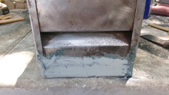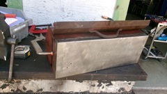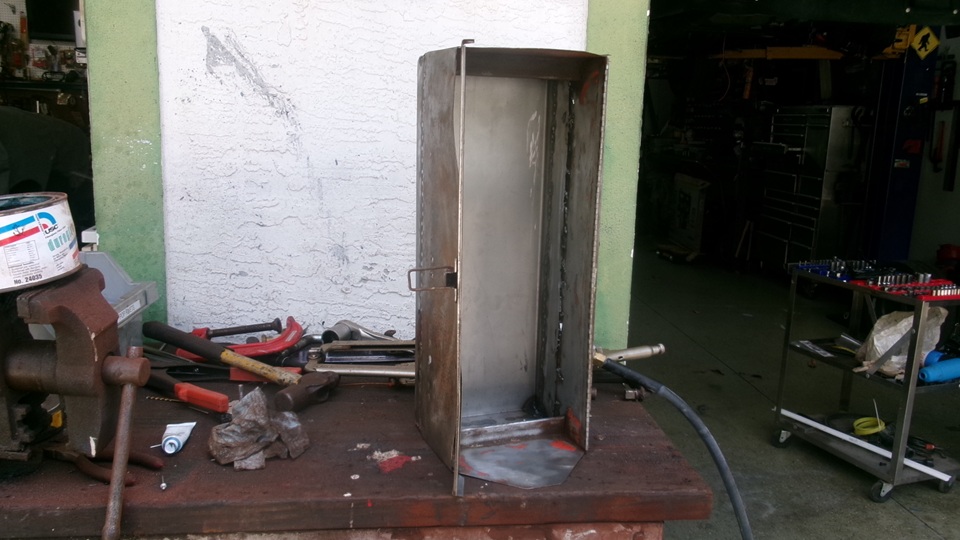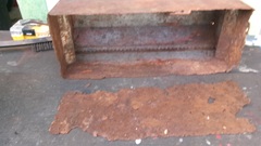 Off to Tech Central again with a bit of a mission (or hobby). We will try to repair (rebuild) a 50 year old steel hip roof tool box. We are rather fond of this box, because of its thin walls and space efficiency (and limited space in the Magic Trailer). You can't buy a replacement like this any more. The problem is, the trailer is often wet inside,so the toolbox has been rusting badly. We have not been able to pick it up for three years, as there is no bottom left in it. After inspection, the first move was to cut one inch from the bottom of the side walls all the way around. And lots of penetrating oil on the lid piano hinges.