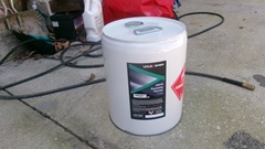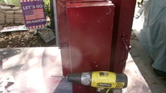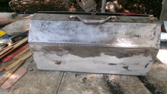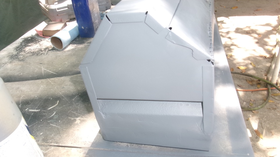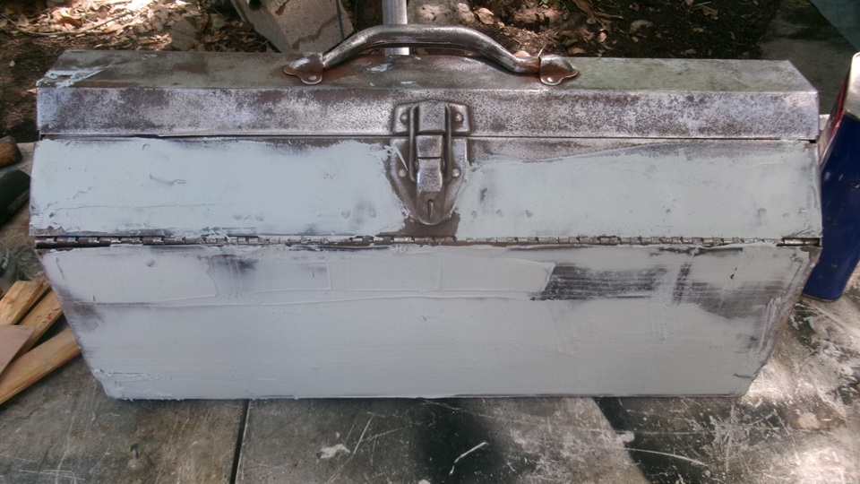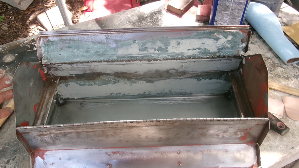 That was the easy part, just spray the primer from an aerosol can. Spray inside first,working through all of the inside corners with blow-back. Spray inside the covers, and over the ends where the cover will overlap, then close it up so we could hold it by the handle. Sitting just over the edge of the table, spray around all for sides. Tilt it 45 degrees on the edge of the table, spray half of the bottom, rotate 180 degrees to repeat on the other half of the bottom. Holding it high by the handle, spray one last pass around all of the bottom corners,and set it down on four big hex nuts. Flip the handle over a couple of times while spraying that last. Wow! That's a lot different from what it looked like yesterday morning.