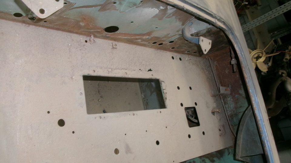 The heater shelf looks good, could touch off a little surface rust in the wiper motor area, Might need a few cage nuts. One more view inside the body nose before we move on.