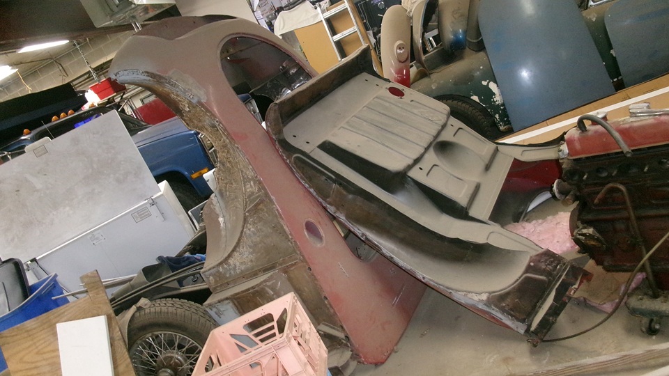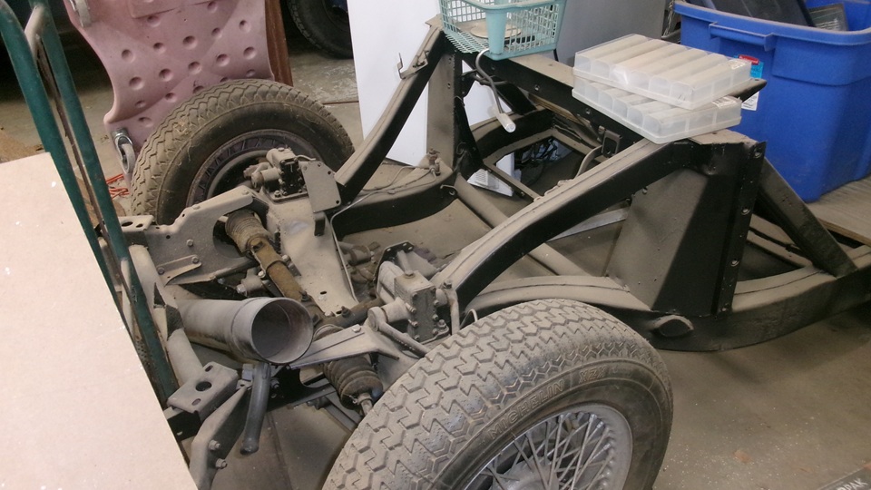 A rolling chassis for another MGA, tunnel parts, convertible top frame, and fuel tank in situ, front and rear main body sections separated at the sills below the doors, more fenders in blue. The more you look, the more you find.