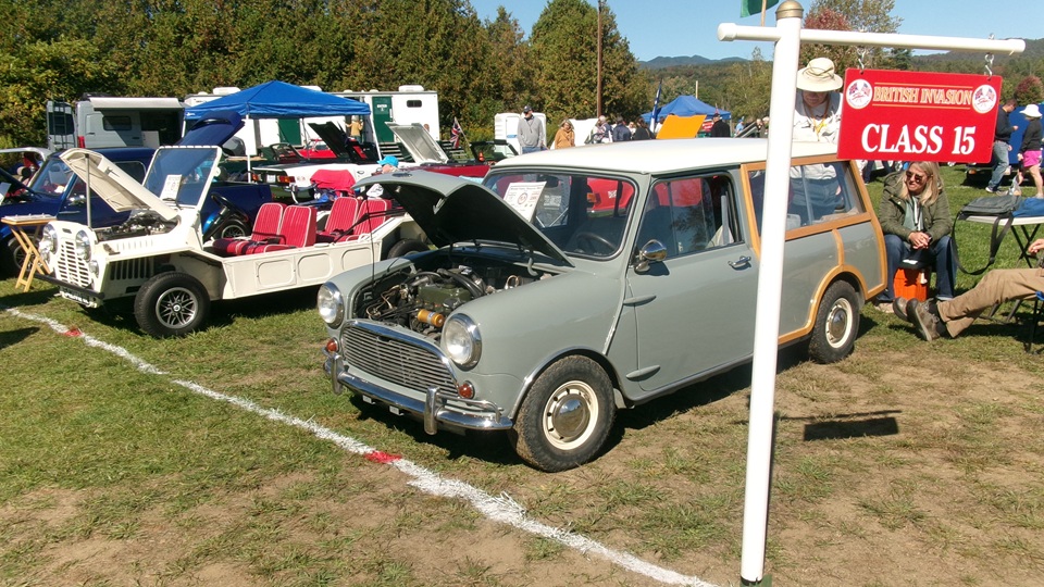 Then heading north through Vermont for an 5-pm appointment to check into The British Invasion car show in Stowe, Vermont, Turned off of VT-108 onto I-89 north, and promptly blew a head gasket while winding the engine up for the long uphill entrance ramp. Bummer, we don't have time for this right now. Cursory inspection revealed combustion gas blowing directly tout the back of the head gasket at the rear head bolt location. Hadn't seen failure at that location before. Oil pressure and water temperature okay, doesn't look to serious, so we opted to remove #4 spark plug to kill combustion and drop the pressure, and drive on running on three cylinders. Sounds like a Briggs and Stratton single cylinder with a bad muffler, but it runs pretty good on three cylinders. We cruised into the car show registration at the Stowe fairgrounds right on schedule at 5:30-pm.