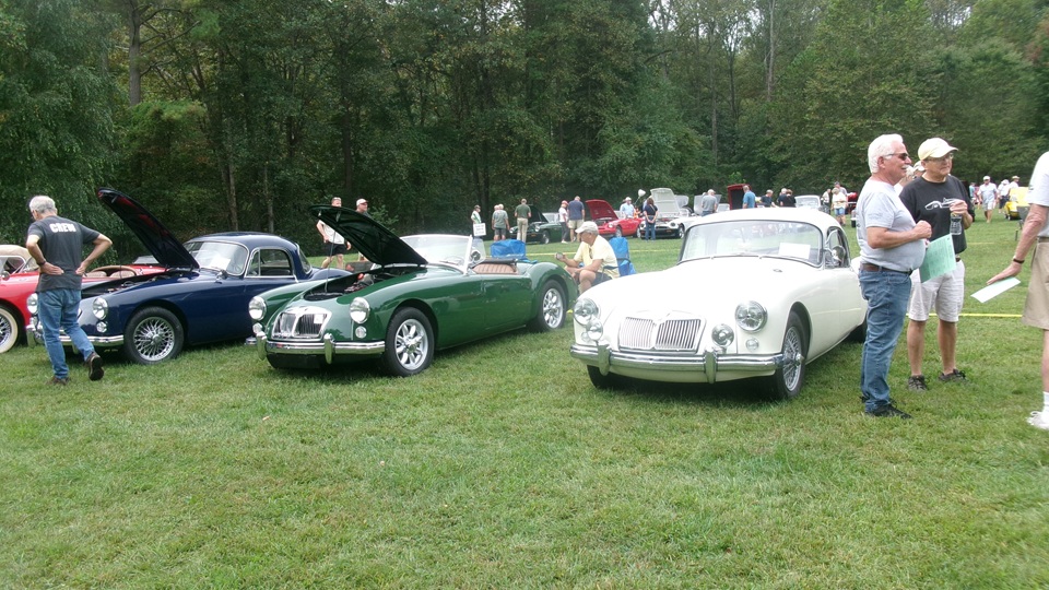 Seven MGA (that I could find, a white Coupe, a black Coupe, a BRG roadster, and four red roadsters, at least two were 1600-MK-II, one of which may have the earlier grille, no Twin Cam.